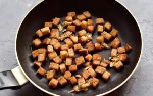 Corte as cascas do pão branco, se desejar, e corte-o em cubos pequenos. Frite o pão em uma frigideira sem óleo até dourar.